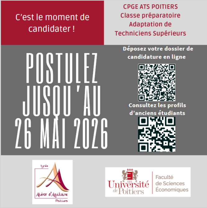 CANDIDATURES EN CLASSE PRÉPARATOIRE ATS 5 mars 2026 Sandrine Peronneau Categories: Actualités https://questionnaire.lycee-alienor.fr/index.php/413694?lang=fr
